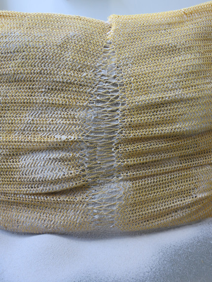 Laura: "Ik beschouw mijn werk als een proces in lagen. Maar in plaats van verflagen toe te voegen of te verwijderen, verzamel ik stof (overblijfselen van een oude constructie bijvoorbeeld) door het ergens vanaf te schrapen (bijvoorbeeld van een muur, een bed, een deur ...). Dit trage proces van laag per laag stof afhalen wordt een dialoog en ik zie hierin een overeenkomst met de schilderkunst. Zelfs als ik een sculptuur maak van de resten die ik verzamel, heb ik het gevoel dat het een onderzoek in de schilderkunst is. De kleur is bijzonder belangrijk, aangezien het de manier is waarop ik het verhaal van datgene dat ik aan het schrapen ben ontdek, vergelijkbaar met hoe je het verhaal van een gezicht ontdekt tijdens het schilderen of fotograferen van markeringen als rimpels. Na het schrapen selecteer ik bijvoorbeeld zorgvuldig de kleuren zodat ik verschillende pigmenten kan hebben om te benadrukken wat ik heb ontdekt. In deze specifieke sculptuur dacht ik in termen van compositie, kleur en alle elementen waaruit een schilderij bestaat. Tegelijkertijd denk ik veel aan het idee van een portret, maar het is een portret dat geen gezicht heeft maar bestaat uit tijd, informatie, nostalgie, en andere elementen van het subject dat ik heb geselecteerd en van mezelf in relatie tot dit "iets/zijn"."